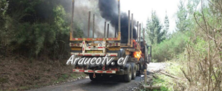 Un camión forestal de la empresa de transportes Covili resultó con su cabina quemada tras sufrir el ataque de 5 encapuchados armados, hecho ocurrido a eso de las 13 horas de este lunes en un camino interior de Fundo El Tránsito, de propiedad de Forestal Mininco, ubicado en el lÃmite entre la octava y novena regiones, comuna de Tirúa.