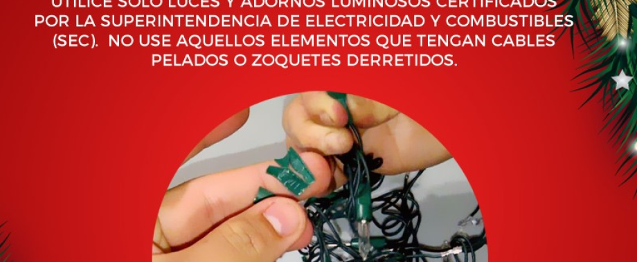 - Utilice solo luces y adornos luminosos certificados por la Superintendencia de Electricidad y Combustibles (SEC). No use aquellos elementos que tengan cables pelados o zoquetes derretidos.
